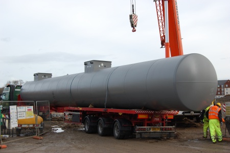 The first of the two giant fuel storage tanks arrived on site on 30th January and was lowered into position within an excavation east of the new forecourt.
