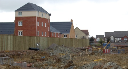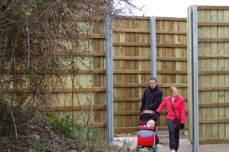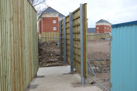 An imposing 3.1 metre (10ft) high wooden fence on two sides of the site of Bradley Stoke’s new town centre is now complete. The structure begins on the access road opposite the new filling station and initially follows the line of a public footpath, skirting first the vacant site originally reserved for Bradley Stoke’s new health centre and then a couple of houses in Manor Farm Crescent. An overlapped gap in the structure allows access from Manor Farm Crescent and Shepherds Walk. The fence then continues up to the corner of the site near the Little Green flats, where there is a second access point for pedestrians and cyclists. The public footpath leaves the town centre site at this point, and continues to The Hedgerows and Dewfalls Drive. Beyond this, the fence continues unbroken to the far corner of the site, behind houses in Dewfalls Drive. There is no access to the site along this stretch of the boundary, in particular at the end of The Hedgerows between the Little Green and The Pasture apartment blocks.