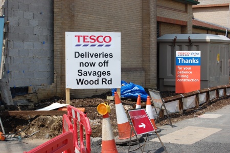 Elsewhere on the site, changes have been made to the route used by delivery vehicles serving the existing Tesco store. Access from Bradley Stoke Way has now been abandoned in favour of a route which requires vehicles to enter the site from the Three Brooks roundabout, then follow the new access road for a short way before making a right turn across the construction site. This is similar to the route that will be used once the Tesco Extra store is complete, when delivery traffic will turn down the road between the Three Brooks public house and the new Tesco filling station to reach the loading bays of the new store.