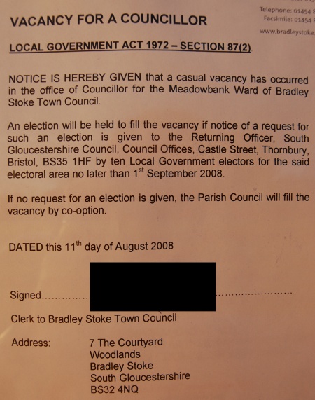 A number of residents, having heard of the vacancy “on the grapevine”, have contacted The Journal to express their surprise that it has not been announced on the BSTC website. Having checked the website, we too have been unable to find any trace of a formal announcement. The last entry in the website’s Latest News and Anouncements section is dated 1st July and concerns events at Bristol Zoo Gardens. Consequently, we are happy to publish a photograph of the Councillor vacancy notice (dated 11th August), which can be viewed by clicking on the above thumbnail image.