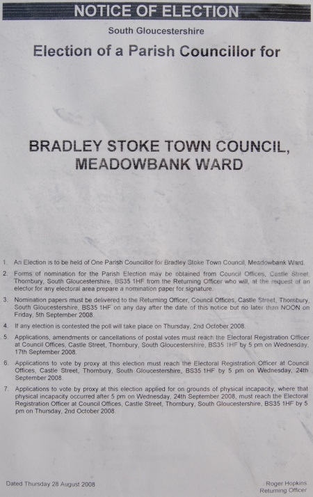 A notice of election for the Town Councillor vacancy in Bradley Stoke’s Meadowbank parish ward has been posted on the Town Council’s noticeboards around the town. Should the vacancy be “contested”, i.e. should there be more than one candidate, the election will take place on Thursday 2nd October.