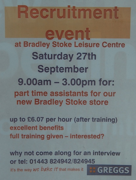 Greggs the Bakers are holding a recruitment day this Saturday (27th September) between 9am and 3pm at Bradley Stoke Leisure Centre. The company is seeking part-time assistants for its new store and is offering £6.07ph (after training).