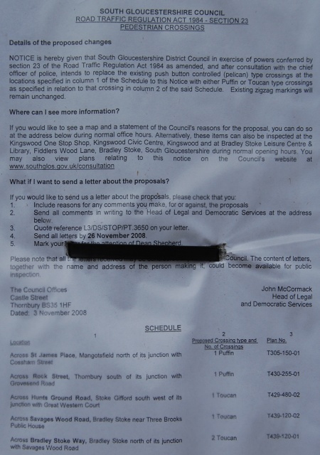 Notices displayed at the two crossings state that the proposals are being made after “consultation with the chief officer of police”. Maps and statements of reasons will be available on the SGC website and at Bradley Stoke Library.