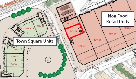 The shop will occupy ‘town centre unit 9’ (shown with a red outline in the plan above), which is part of the phase 2 ‘retail terrace’ building and separated from the main body of the Town Square by a bus lane.