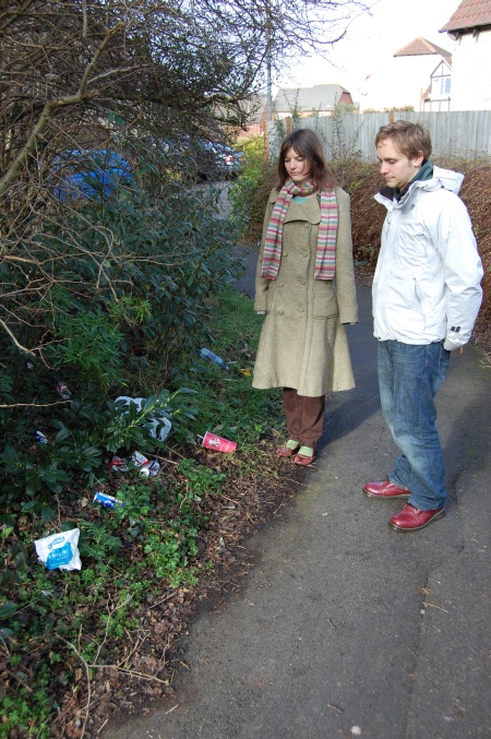 Holly Mieville-Hawkins (pictured with husband Luke Palmer), who lives in Dewfalls Drive, has delivered a protest letter to a number of stores at the centre. In the letter, she claims that “the volume of wrappers, packets and plastic bags from Tesco and the other stores littering the surrounding area has increased expeditiously” since the development opened its doors to the public in October 2008.