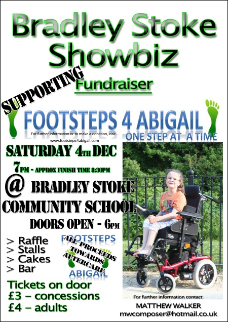 The final fundraisng event in the Footsteps 4 Abigail campaign, a Showbiz spectacular, is being held this Saturday (4th December) at Bradley Stoke Community School, from 7pm to 8:30pm. All monies raised will go towards Abigail’s aftercare. Tickets (£4/£3) are available on the door.