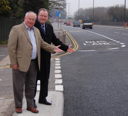 Photo L-R: Cllr Brian Allinson (Executive Member, South Gloucestershire Council) and Tony McNiff (Managing Director, First Bus Bristol, Somerset and Avon) welcome the opening of the A38 bus lane near the Aztec West Roundabout.