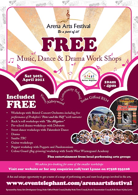The event is sponsored by Arena Arts Development Group, Stoke Gifford Parish Council, Bradley Stoke Town Council, South Gloucestershire Council, Rolls-Royce & John Lewis.