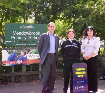 CJ Hole Bradley Stoke Property Centre recently handed over the road safety signs to Meadowbrook Primary School, to encourage parents to park safely and refrain from parking on the yellow zig-zag lines outside the school.