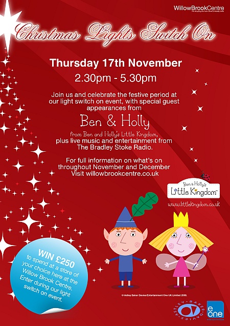 The Christmas lights at Bradley Stoke’s Willow Brook Centre will be switched on this Thursday afternoon (17th November 2011) when Ben & Holly from Ben & Holly’s Little Kingdom make a special guest appearance.