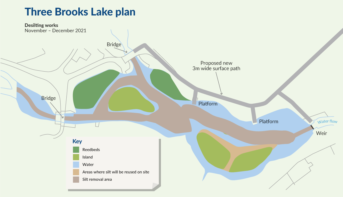 Work on the improvements to the path around the lake, along with cutting back weeds and undergrowth between the stone bridge off Juniper Way and the bridge at the lake, is scheduled to take place in spring 2022, after the desilting work has been completed.